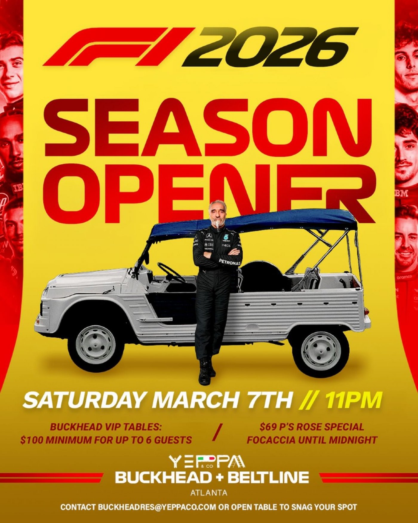 The lights go out on the 2026 Formula 1 season opener on Saturday, March 7 at 11 p.m., and Yeppa Buckhead is airing every lap—sound on, screens up, doors open until the end of the race. With sweeping new regulations, a new World Champion in Lando Norris, and an expanded grid welcoming Cadillac as the sport’s 11th team, the opener marks the start of a new era Yeppa Buckhead is ready. The race will air with full sound and reservations available via OpenTable, with VIP tables offered by email at [email protected]. Buckhead table details include a $100 minimum for up to six guests and $69 P’s Rosé magnums available for the table. Focaccia will be served until midnight, while the main kitchen closes at regular hours. Yeppa Buckhead is located at 306 Buckhead Ave NE, Atlanta, GA 30305. For more information or to book, visit www.yeppaco.com and follow @yeppacoatl.