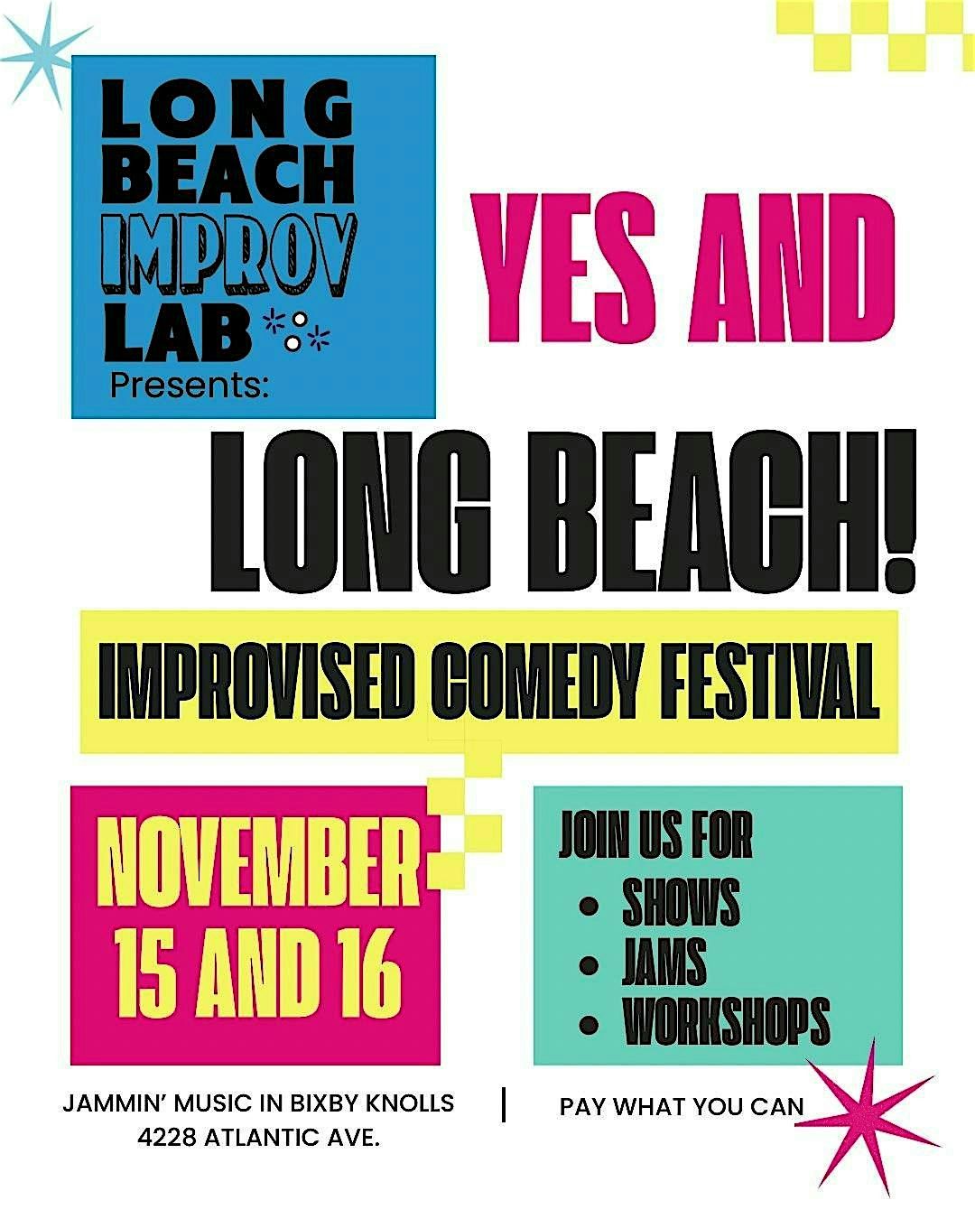 Welcome to the first ever improvised comedy festival happening in Long Beach: Yes And Long Beach! at Jammin' Music on November 15th and 16th (Pacific Time). Get ready to laugh until your sides hurt as over 50 talented comedians take the stage over the course of two days. Tickets are Pay What You Can, and each ticket grants you full access to each day's shows. Join us for a one-of-a-kind experience where every joke is made up on the spot. Don't miss out on this hilarious weekend filled with spontaneity and laughter. See you there!