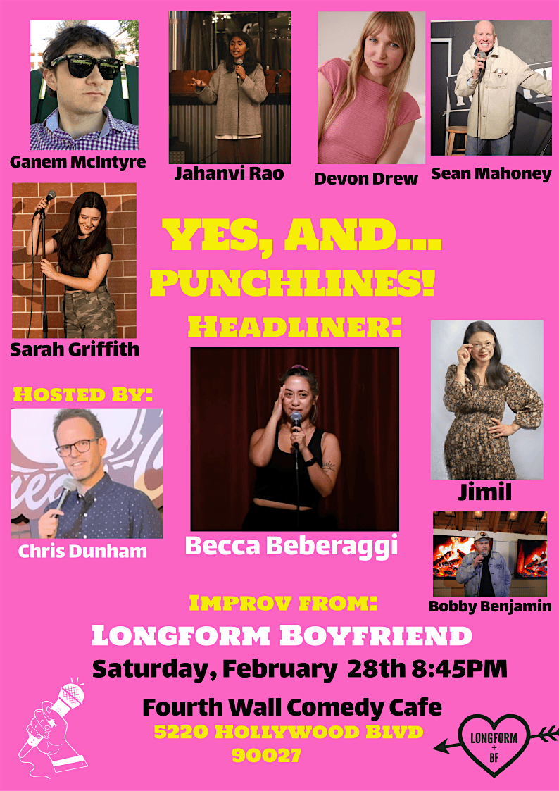 Get ready for a night full of laughs at Fourth Wall Comedy! Join us on February 28, 2026 at 8:45 PM (Pacific Time) for some quick wit and hilarious improv. Whether you're a comedy fan or just looking for a fun night out, this event promises plenty of punchlines and good vibes. Don’t miss out on the fun—bring your friends and enjoy an unforgettable evening of laughs!