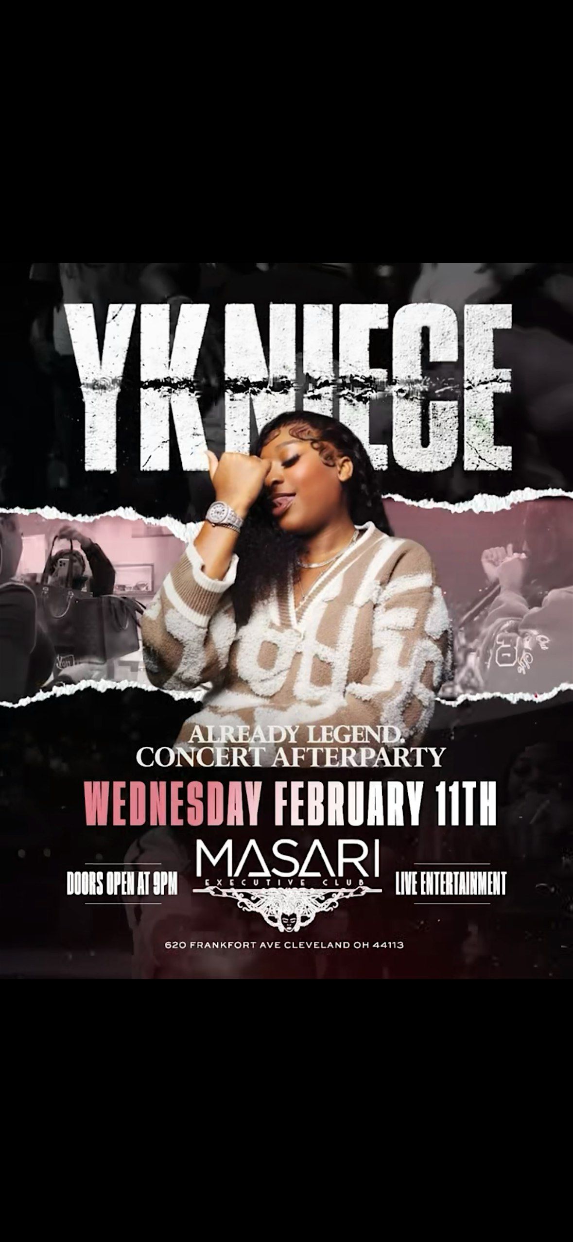 YK NEICE WILL BE AT MASARI!! Her and some of her friends!! (620 Frankfort Cleveland Ohio) on Wednesday February 11th. Come turn up after the concert. Doors open at 7!! 216-293-0744 for sections