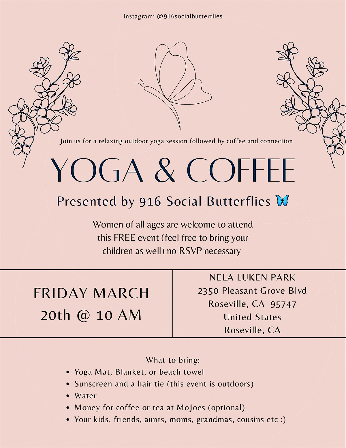 Join us for yoga and coffee in the park! This event is completely free and open to women of all ages! I created 916 Social Butterflies because I wanted a space where women in the 916 area could get together, try new things, and make genuine friendships.