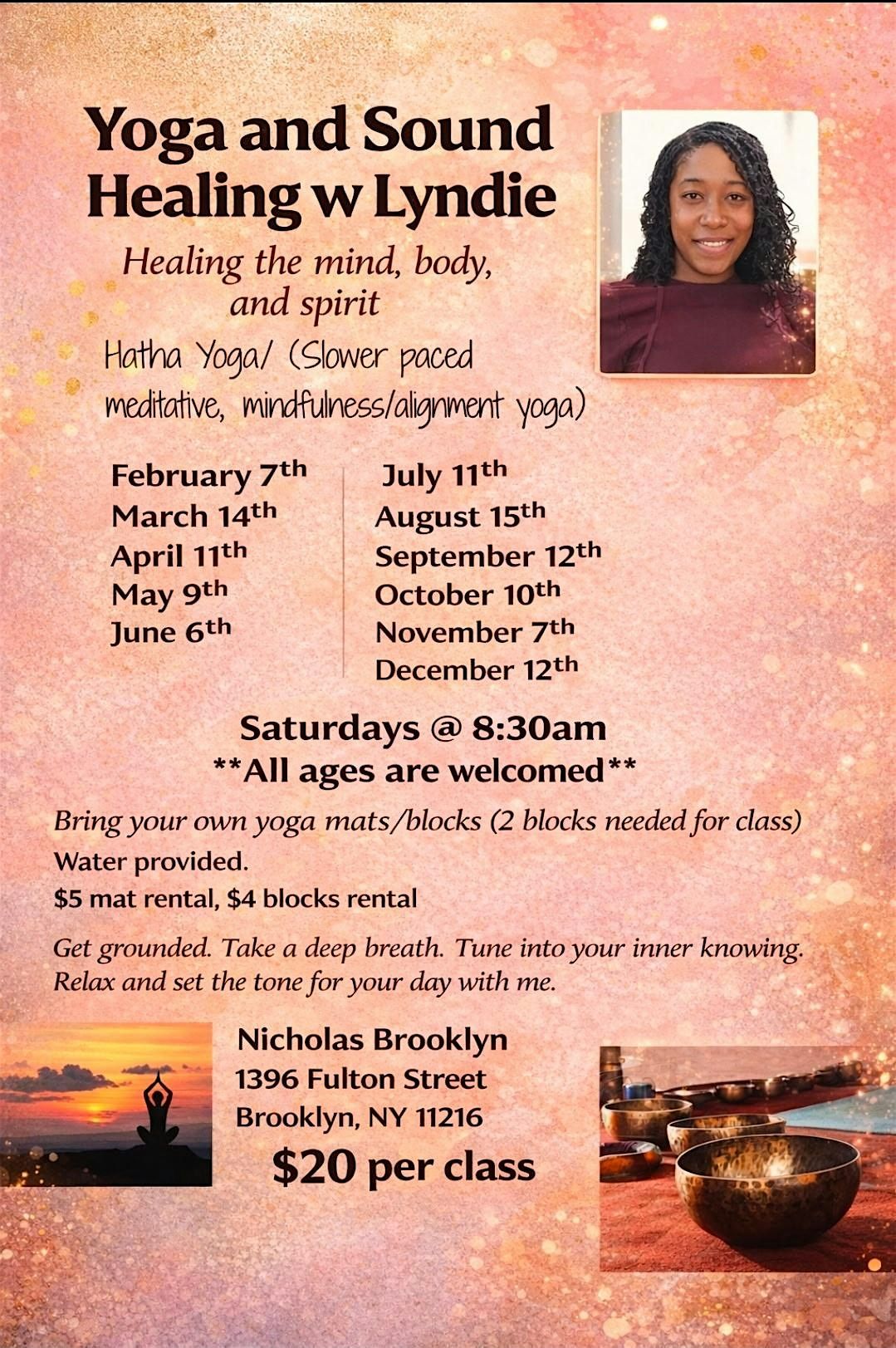 Welcome to Yoga and Sound healing with Lyndie at Nicholas Brooklyn! Join us once a month starting Saturday February 7th, 2026 at 9 AM (SUGGESTED ARRIVAL 8:30AM FOR SET UP) for a rejuvenating experience. Let's unwind, stretch, and find inner peace together. I will guide us through a session that combines the soothing practice of yoga with the healing power of sound. We practice Hatha Yoga where we focus on inner connection of self, breath, and mindfulness. This is a perfect opportunity to relax and recharge. Don't miss out on this unique event! See you there!