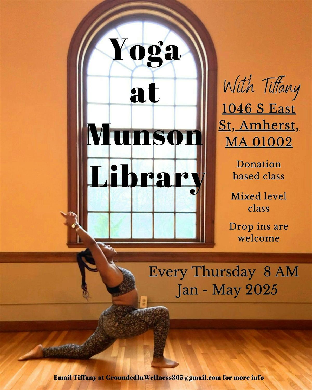 Join Tiffany every Thursday at 8 am at Munson Library in South Amherst MA for an indoor yoga experience.