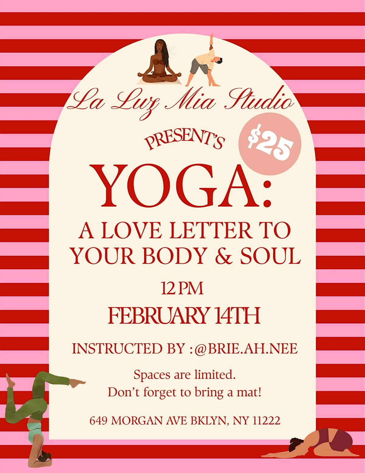 This event is a beautiful way to send a love letter to both your body and soul through mindful movement, breath, and positive vibes. Whether you're new or experienced, come as you are and experience a peaceful, uplifting time that leaves you feeling refreshed and centered.