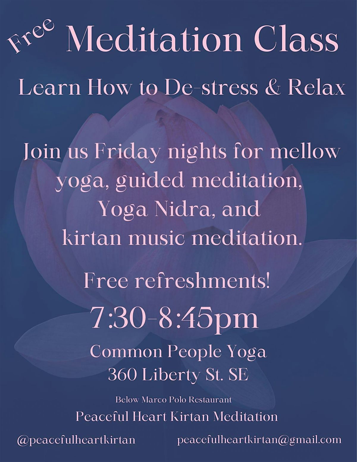Music meditation soothes the heart and soul! We offer meditation for whoever feels like they may benefit-that's you! The class consists of guided meditation, chair yoga stretches, yoga breathing, Yoga Nidra, and music meditation. Free and includes homemade baked goods and herbal tea. Easy going, friendly, and enlightening.