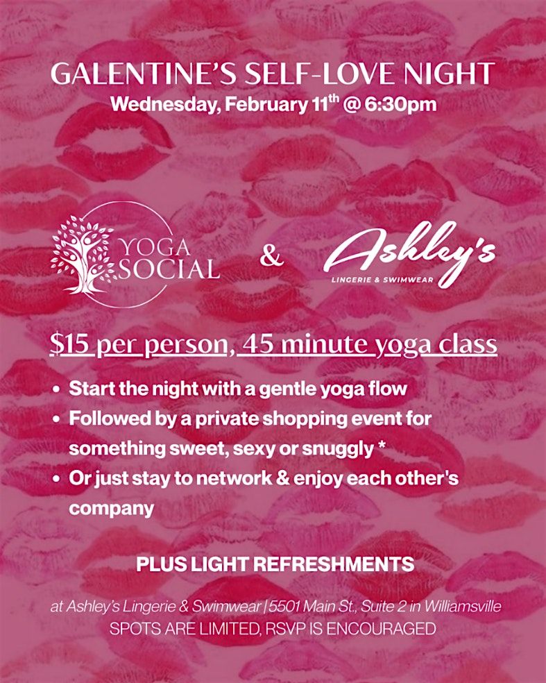 Yoga Social is teaming up with Ashley’s Lingerie & Swimwear AGAIN for a special Galentine’s celebration filled with movement, connection, and a little sexy confidence.