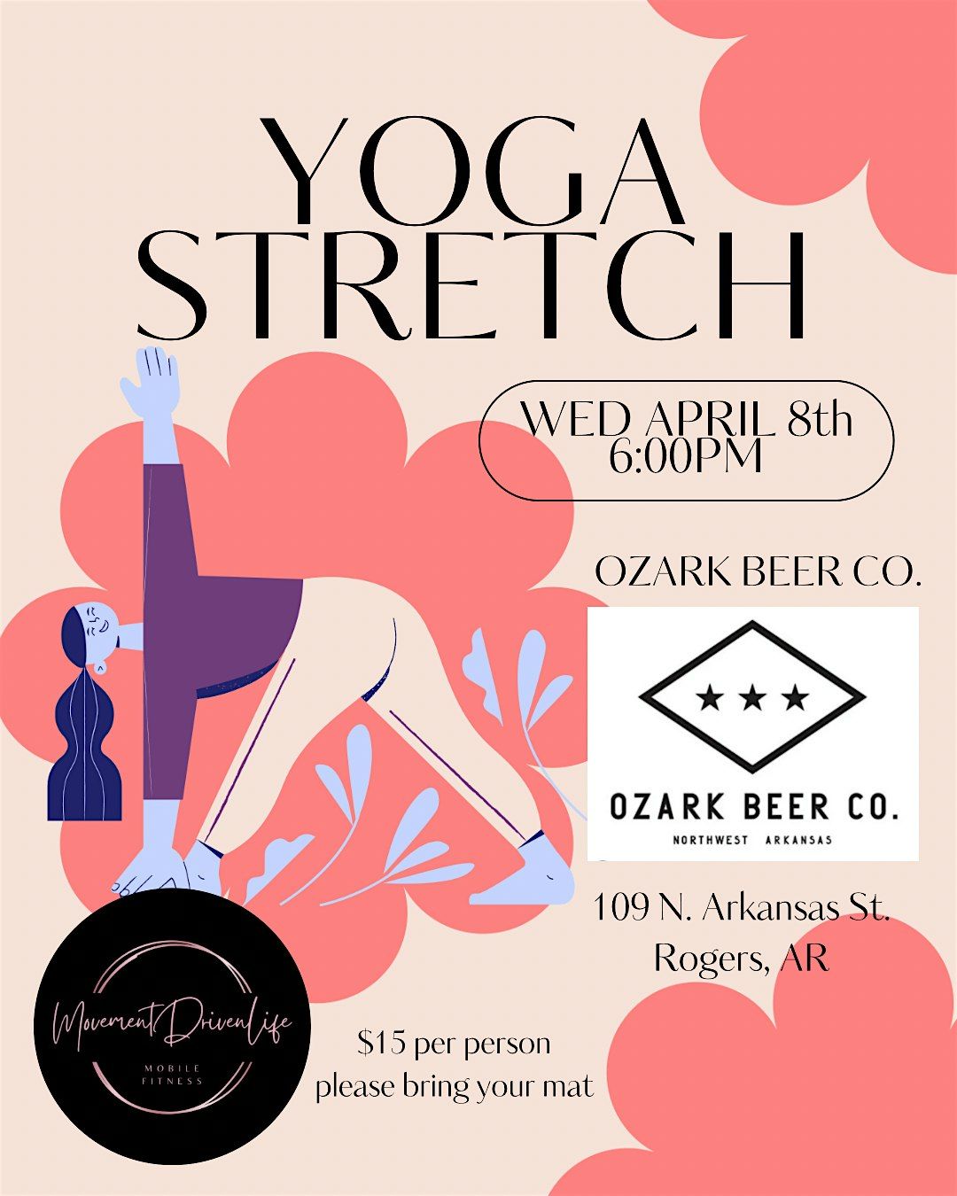 Movement Driven Life, NWA's first mobile fitness studio, is leading this relaxing yoga stretch. Join us upstairs at Ozark Beer Co, bring your mat, grab a drink and stretch away the stress of the day!
