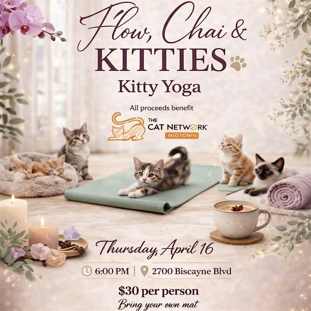 Flow, breathe, and connect—surrounded by playful, adoptable cats and kittens from The Cat Network at Midtown Petsmart. This special one-hour class combines energizing yoga flow, intentional breathwork, and the joy of interacting with adorable feline friends. More than just a unique experience, every ticket helps support The Cat Network’s life-saving work—funding rescue, care, and adoption efforts for cats and kittens in need. Come move with purpose, support a great cause, sip some chai, and maybe even meet your future furry best friend. 100% of proceeds benefit The Cat Network (thecatnetwork.org).