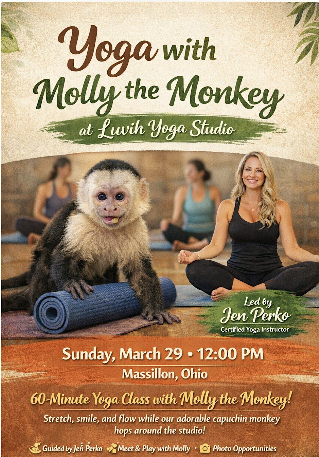 Join us for a one-of-a-kind Yoga with Molly the Monkey experience at Luvih Yoga Studio on Sunday, March 29 at 12:00 PM!