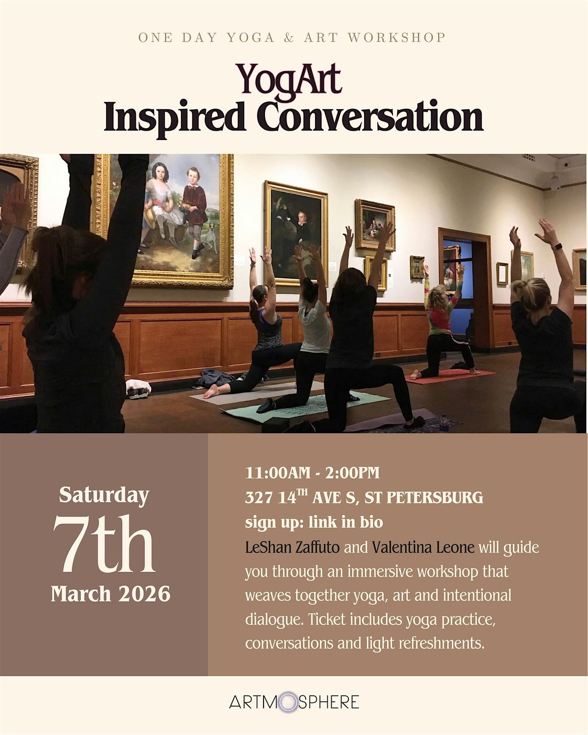 Join us for YogArt: Inspired Conversation, a unique one-day workshop that blends yoga, art, and intentional dialogue in a curated gallery setting at Artmosphere.