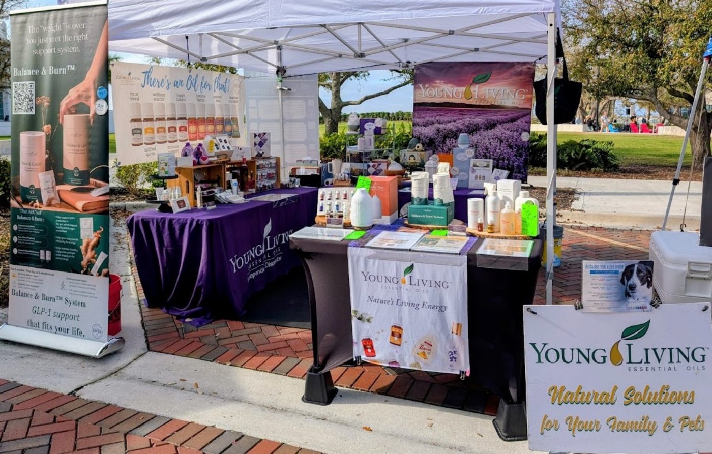 The Young Living booth is located along side the green park area in Downtown Wellen Park in Venice / North Port Florida.