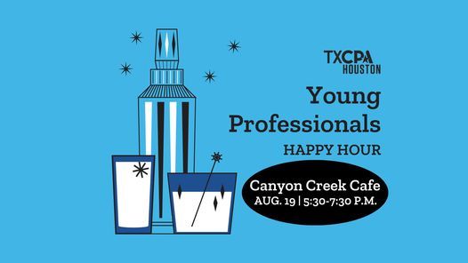 Join TXCPA Houston's Young Professionals at their first in-person happy hour of 2021! Canyon Creek Cafe at 6603 Westcott St, just south of I-10 is the place to be at 5:30 p.m. on Thursday, August 19. Appetizers and your first drink are on us! Plan now to attend to renew old friendships and develop new business connections. Location: