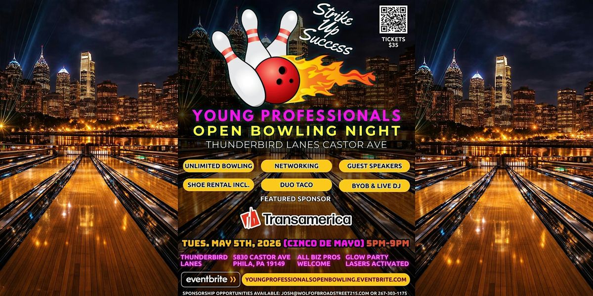 Join us on Tuesday, May 5, 2026 from 5 PM to 9 PM at Thunderbird Lanes on Castor Avenue for Young Professionals Open Bowling Night - Strike Up Success, a Cinco de Mayo evening built for connection, conversation, and a great time. This 21+ event brings together young professionals and business-minded guests for a unique after-work experience that blends networking, music, food, a guest speaker, and unlimited bowling under the glow party lights.