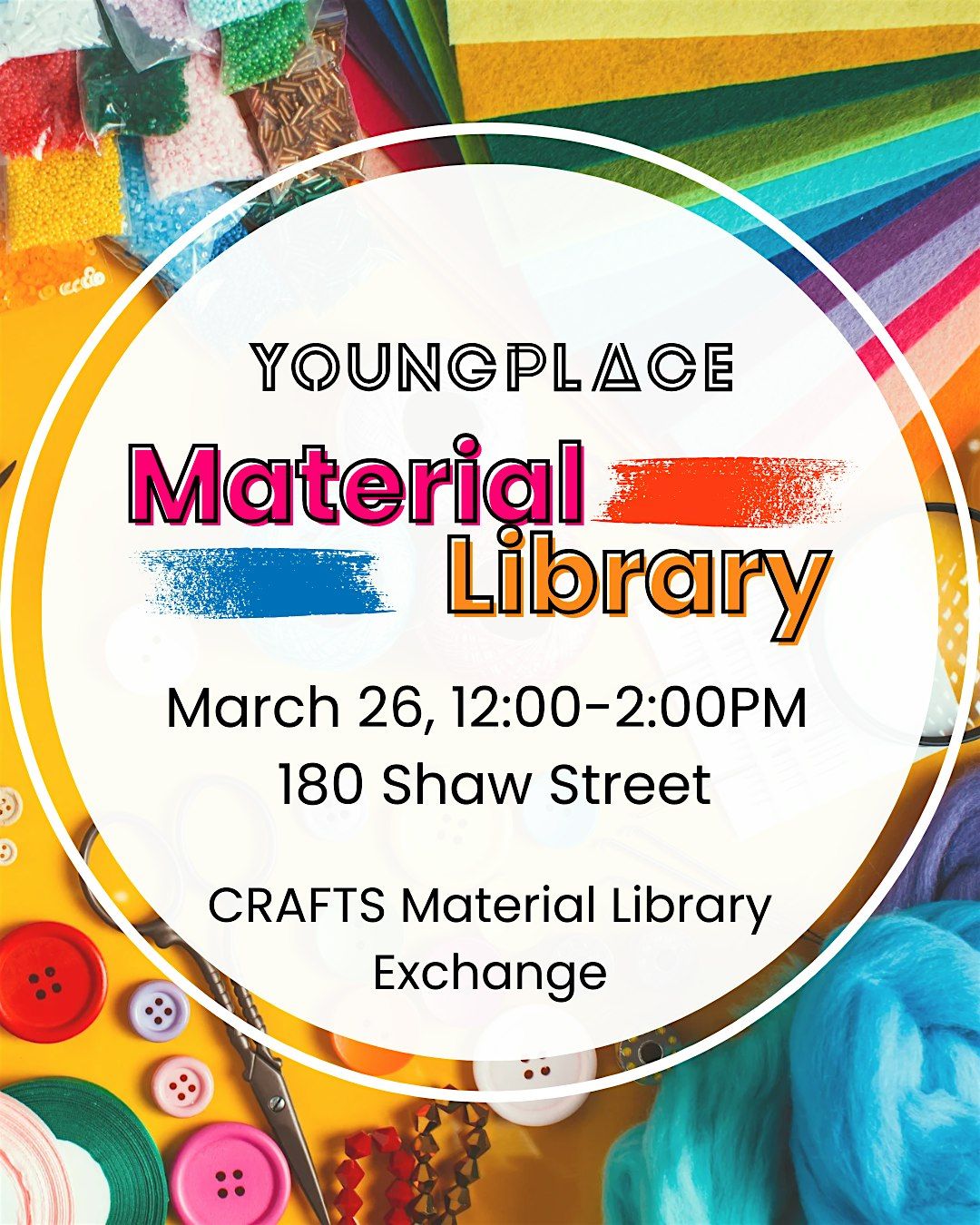 Join us for a Community Material Exchange! Sharing, swapping, and donating at the Youngplace Material Library, on March 26th, from 12PM – 2PM.