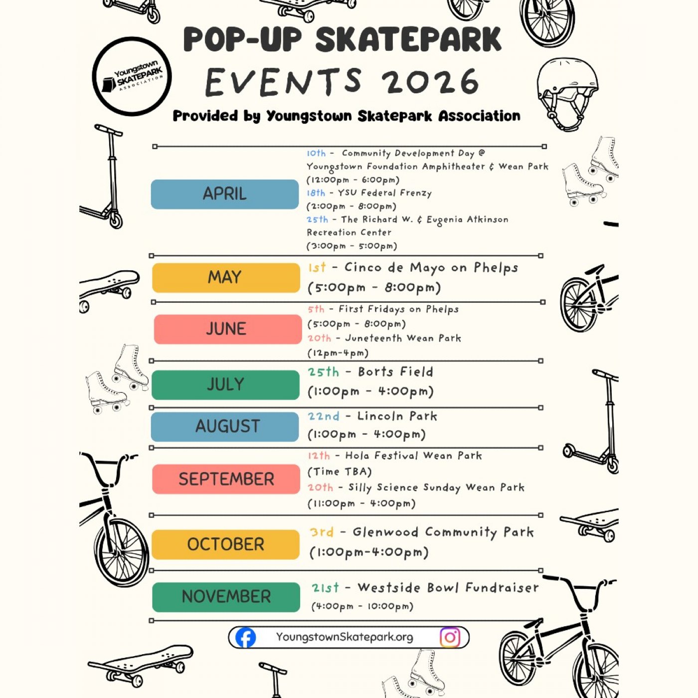 The event will provide a safe and welcoming environment for riders of all skill levels, while raising awareness and support for YSA’s mission to advocate for the creation, development, and long-term maintenance of a free, public, skatepark in the City of Youngstown.