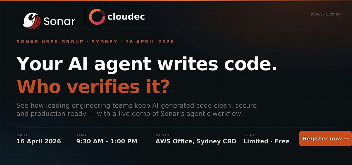 Join us for the inaugural Sonar Meetup Sydney, hosted at the AWS Sydney Office, to see how leading engineering teams are solving the last unsolved problem in agentic development: keeping AI-generated code clean, secure, and standards-compliant β automatically.