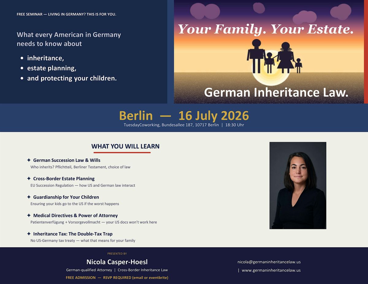 Join German-qualified attorney Nicola Casper-Hoesl for a free 60-minute seminar on German inheritance law and estate planning -- specifically designed for US citizens and expats living in Germany.