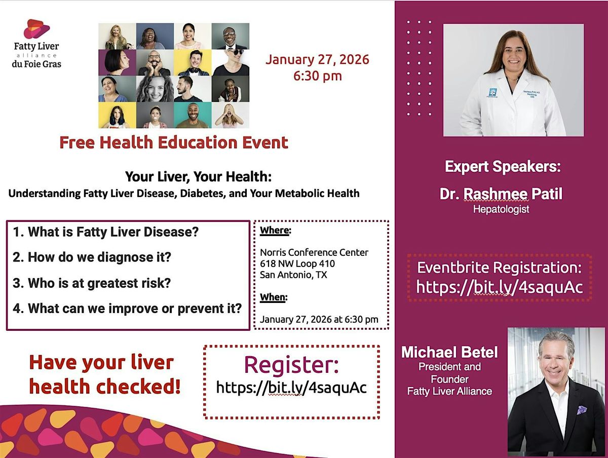 Welcome to Your Liver Your Health San Antonio: Understanding Fatty Liver Disease, Diabetes! Join us for an informative session at the Norris Conference Center (LIVE OAK ROOM) where experts will discuss the importance of liver health and its connection to diabetes. Learn about the impact of fatty liver disease on your overall well-being and how to manage it effectively. Don't miss out on this opportunity to gain valuable insights into protecting your liver and maintaining a healthy lifestyle. See you there!