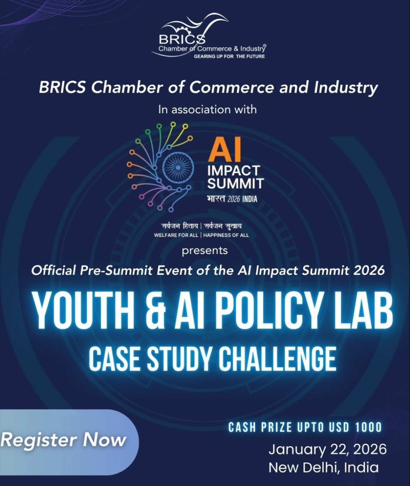 The BRICS Chamber of Commerce & Industry, in association with the AI Impact Summit 2026, is now inviting registrations to attend the Youth & AI Policy Lab β Case Study Challenge, a flagship, in-person policy engagement for youth and institutional delegations from BRICS+ nations.
