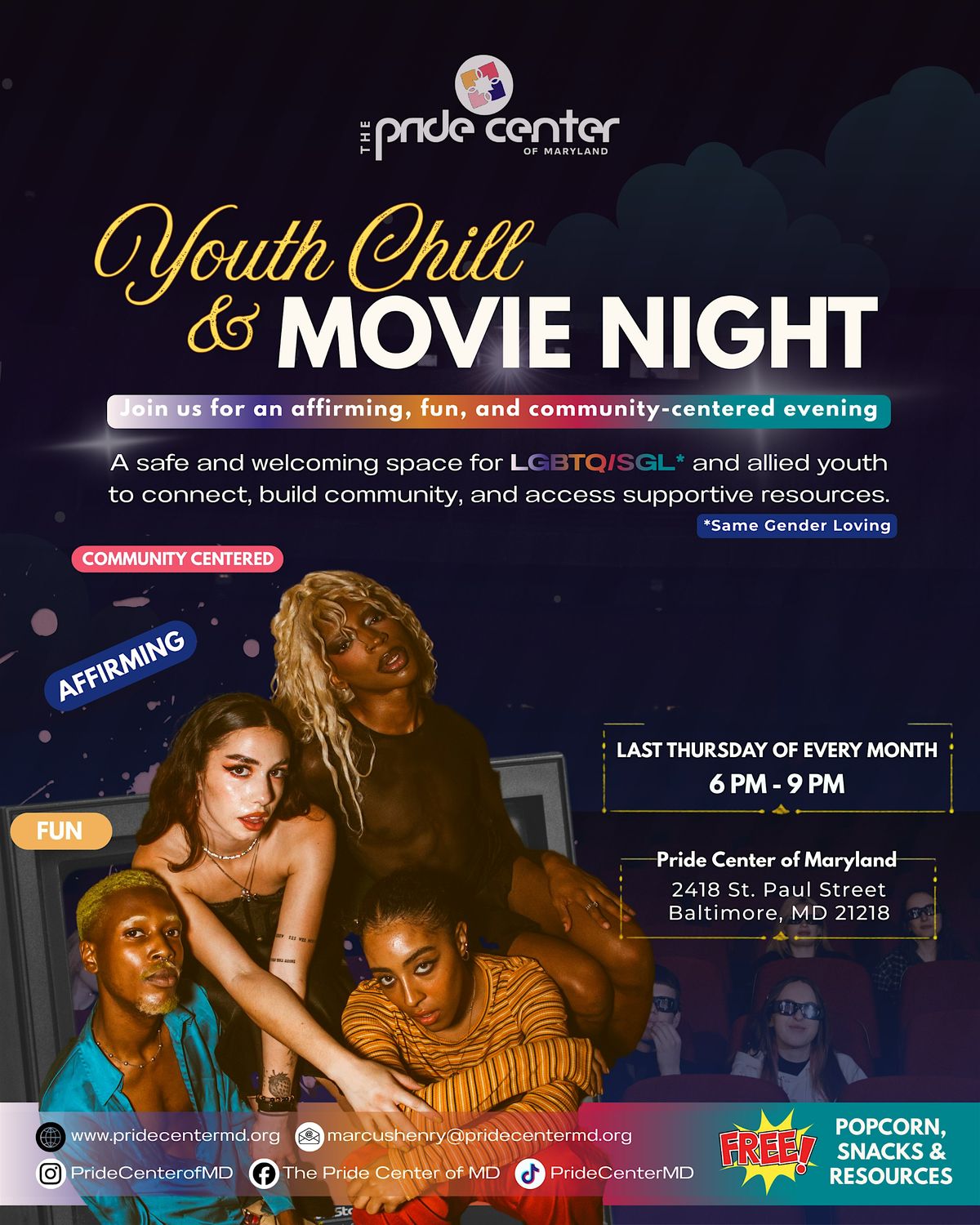 Join us at the Pride Center of Maryland to watch a selected film and engage in a facilitated discussion following the film. Snacks provided!