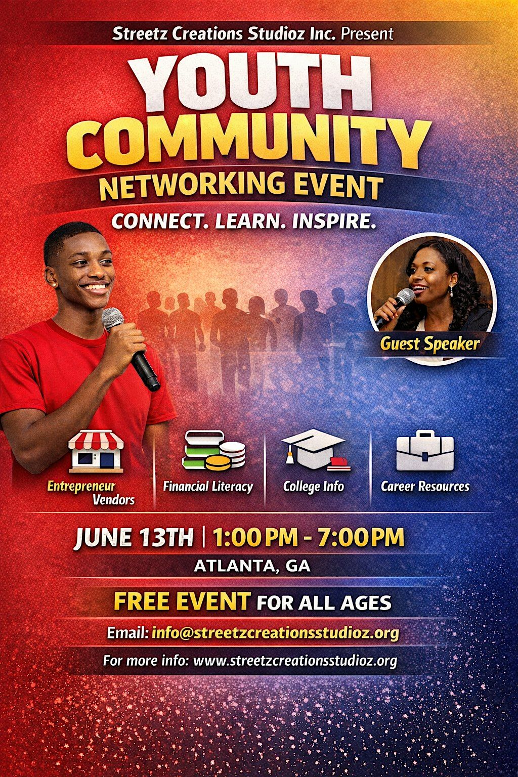 Join us on June 13, 2026 from 1:00 PM – 7:30 PM in Atlanta, GA, for an empowering and impactful day at the Youth Community Networking Event, hosted by Streetz Creations Studioz Inc..