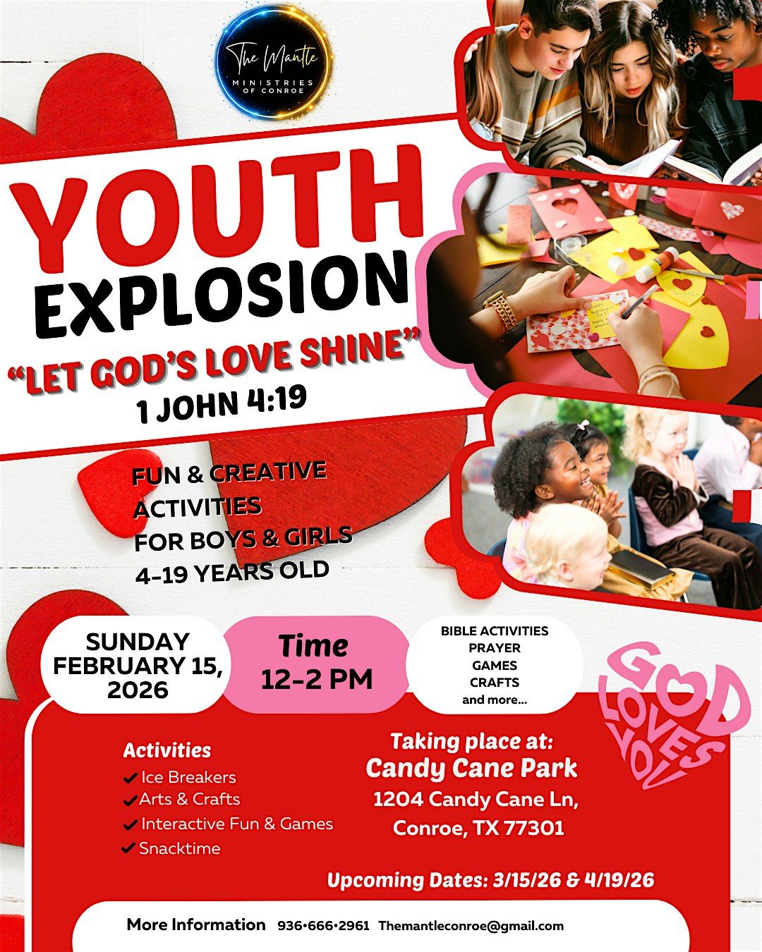 Get ready for a powerful event where faith, joy, and God’s love take center stage! 🌟 This Youth Explosion is all about letting His love shine through us — in how we worship, how we serve, and how we love one another.