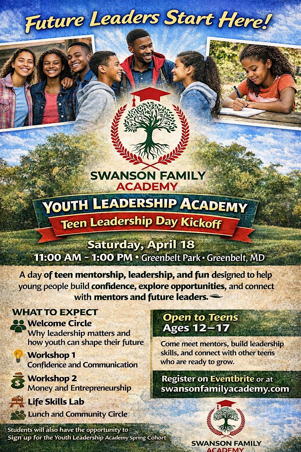 Join Swanson Family Academy for our Teen Leadership Day Kickoff, launching the Youth Leadership Academy, a mentorship program designed to help teens build confidence, leadership skills, and a vision for their future.