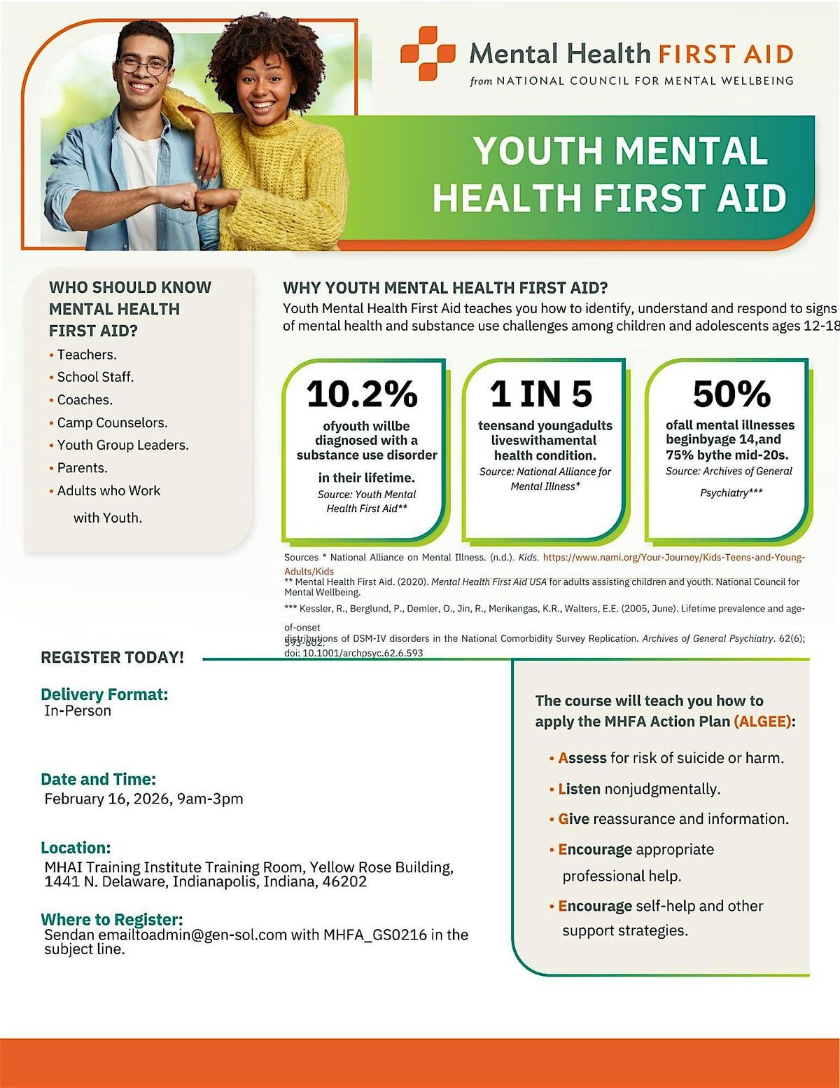 Join us for an in-person training designed to equip you with practical skills to support young people navigating mental health challenges. This engaging and interactive workshop will help you recognize early warning signs, provide effective initial support, and confidently connect youth to appropriate professional resources. Ideal for parents, educators, and anyone who works with or cares for young people. Don’t miss this opportunity to make a meaningful impact.