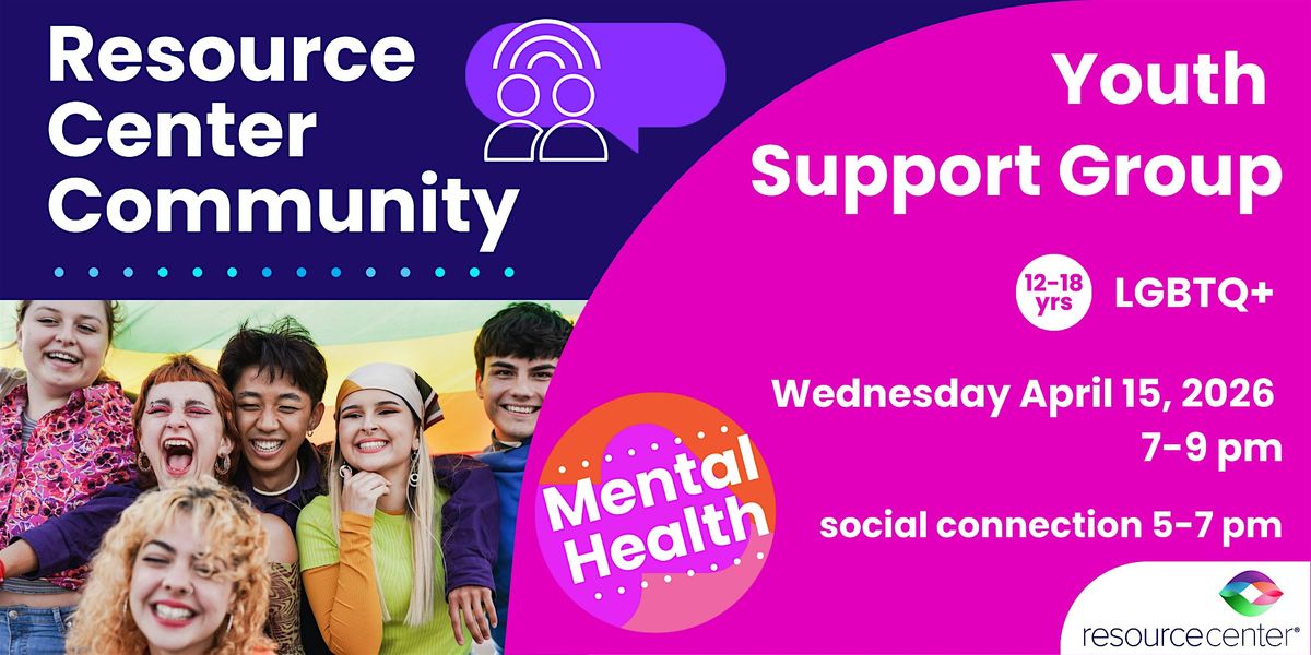 Join us at the Resource Center - Community Center on April 15, 2026 at 7:00 PM for a supportive and welcoming space. This group is all about supporting youth exploring LGBTQ+ topics that come up in their lives. This group will be facilitated by a Licensed Social Worker to help guide youth through topics and questions that come up. Everyone’s welcome, so bring your true self and let’s build community together!