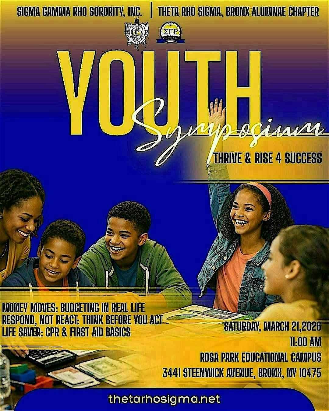 The Sigma Gamma Rho Sorority, Inc. – Theta Rho Sigma Bronx Alumnae Chapter proudly presents our Youth Symposium: Thrive & Rise 4 Success — an empowering and interactive experience designed to equip young people with real-life skills they can use now and in the future.