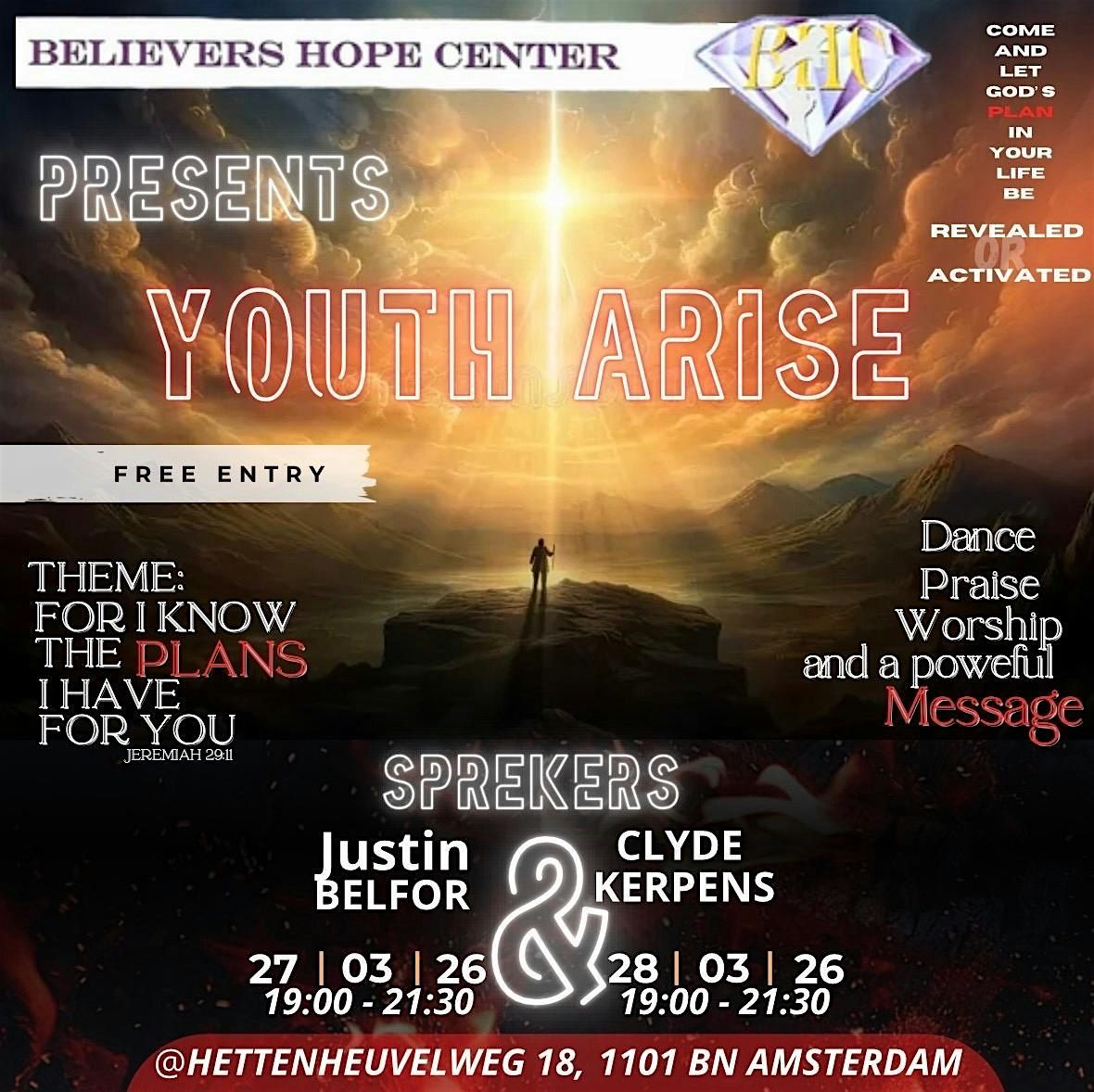Come join us at Hettenheuvelweg 18 on March 27 & 28, 2026 at 7:00 PM (Europe/Amsterdam Time) for an inspiring evening centered around the theme "I know the plans I have for you Jeremiah 29:11".