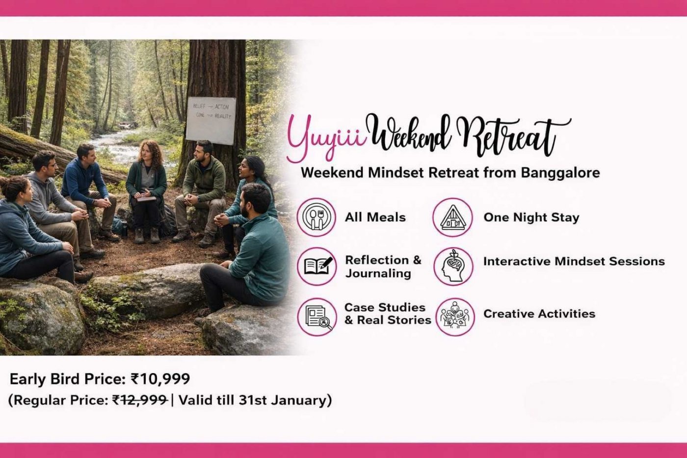Yuyiii’s Weekend Mindset Retreat is a thoughtfully curated 2-day experience designed to help you slow down, reflect, and realign. Set in a calm, nature-led environment, the retreat brings together guided conversations on mindset, clarity, self-awareness, and intentional growth.