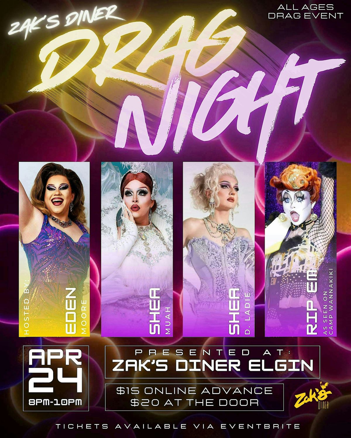 Drag Night! is back by popular demand Friday, April 24th at Zak's Diner Elgin!