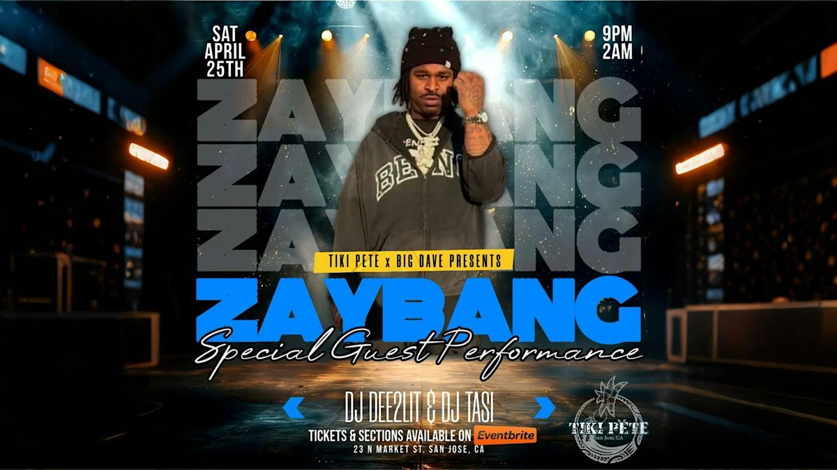 Join us for an electrifying evening with live performance by Zaybang and sounds by DJ Tasi & DJ Dee2Lit at Tiki Pete! Get ready to experience the best of live music in the heart of San Jose, CA. This in-person event promises an unforgettable night filled with incredible performances and a vibrant atmosphere.