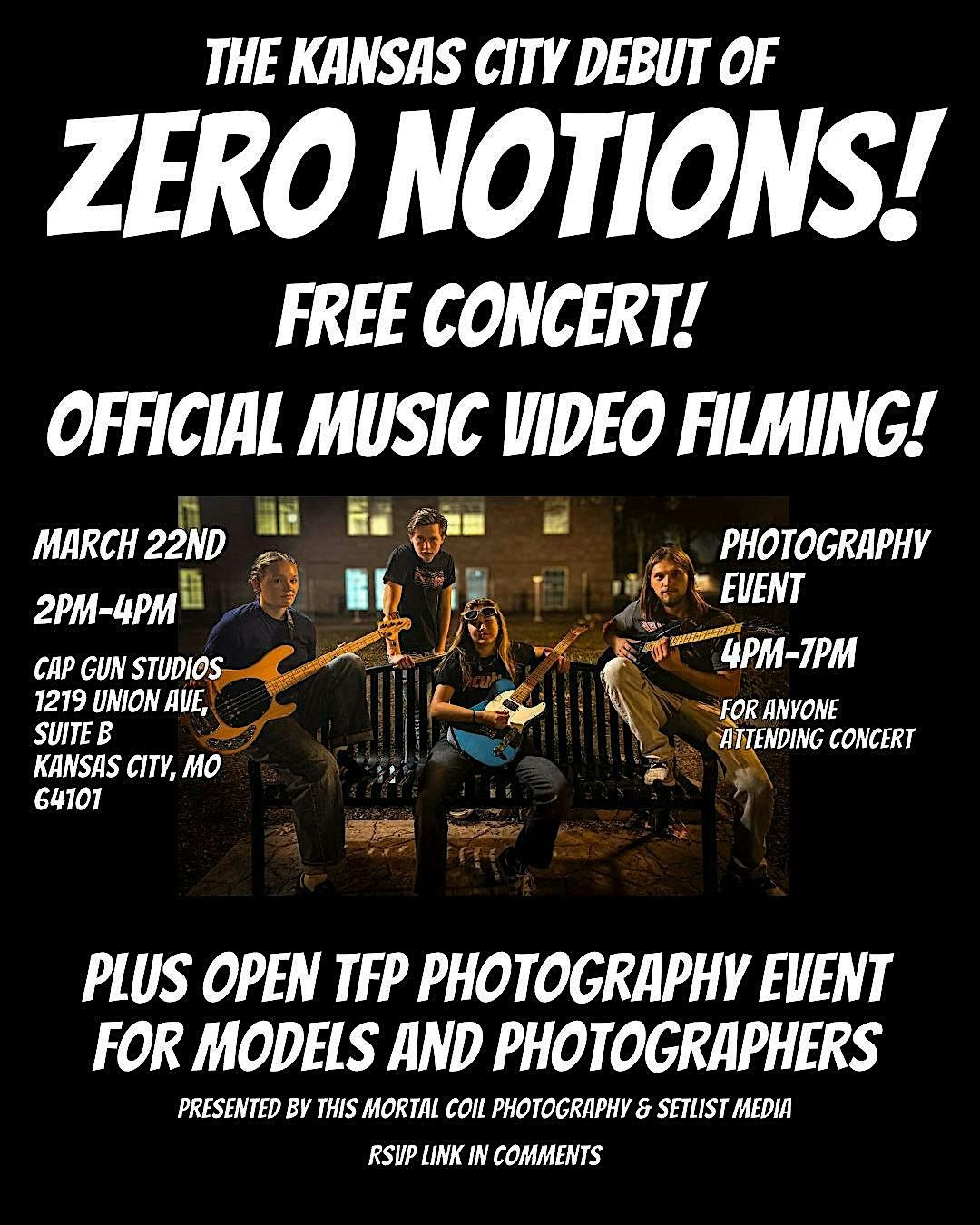 Zero Notions is a fantastic band out of Warrensburg. They will be making their KC debut at Cap Gun Studios in the historic West Bottoms. We will be filming a music video prior to the start of their live concert. Additionally, there will be an open TFP Photography event immediately following.
