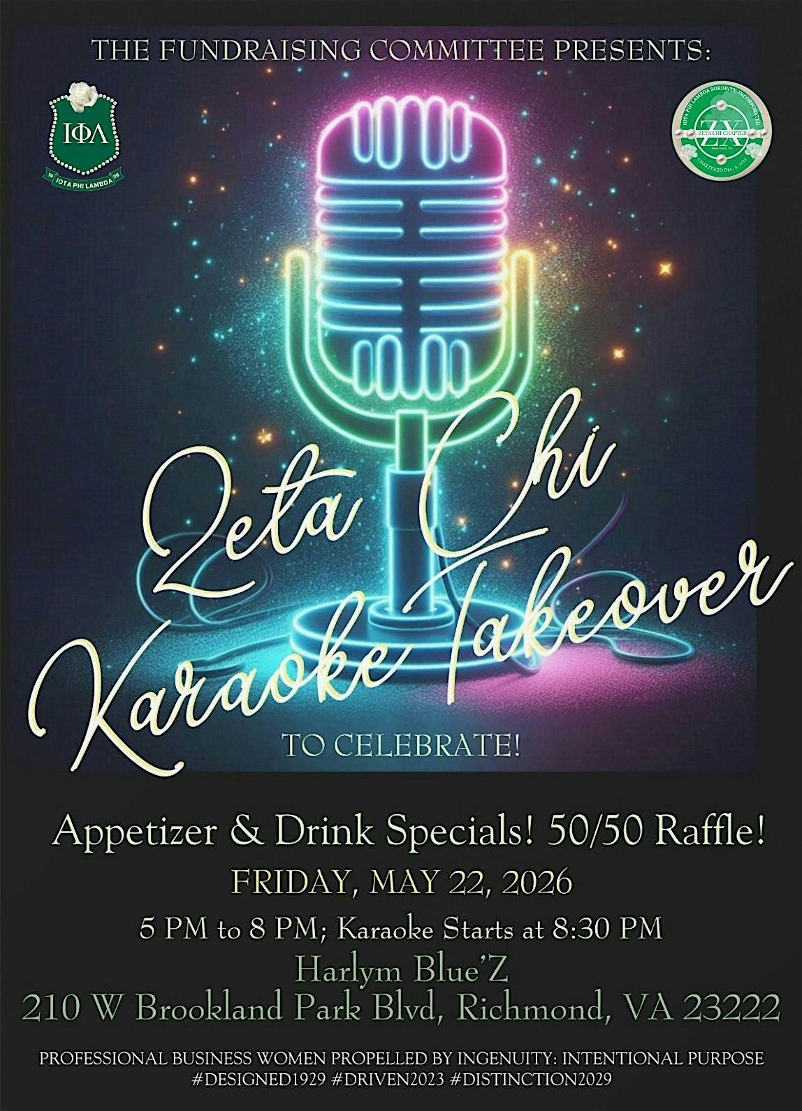 Get ready for a night of music, fun, and sisterhood at the Zeta Chi Karaoke Takeover! Join us for an exciting evening featuring great vibes, delicious appetizer and drink specials, and a chance to win big with our 50/50 raffle.