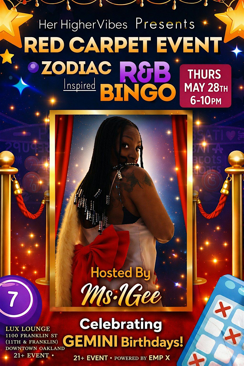 Welcome to Zodiac Inspired R&B BiNGO OAKLAND! Get ready for a night of music, fun, and games at Lux Oakland.