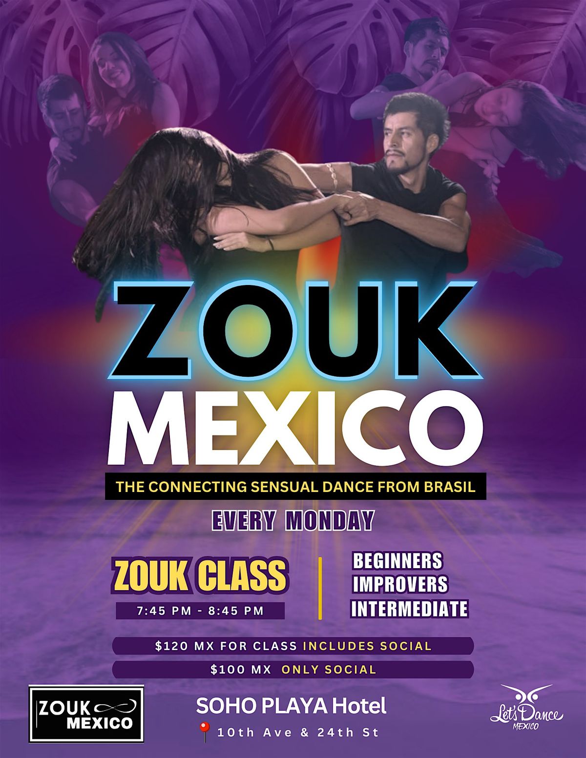 ✨ Join us at the incredible rooftop of the SOHO PLAYA Hotel where we will introduce you to the sensual dance of ZOUK! Whether you’re a beginner or intermediate dancer, we have a class for you to start the night. Afterwards, we open the dance floor for social dancing and mingling with the great Zouk community!
