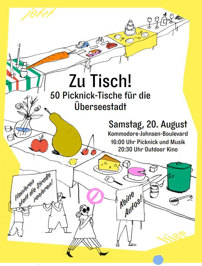 Am 20. August veranstaltet die Überseestadt auf 300 Metern Boulevard ein Picknick mit 50 gedeckten Tischen. Das bedeutet: Kein Verkehr und keine Autos auf dem Kommodore-Johnsen-Blvd. Richtung Waller Sand von 13-24 Uhr. Der Abschnitt ab der Ehrenfelsstraße bis Kommodore-Ziegenbein-Allee wird gesperrt.