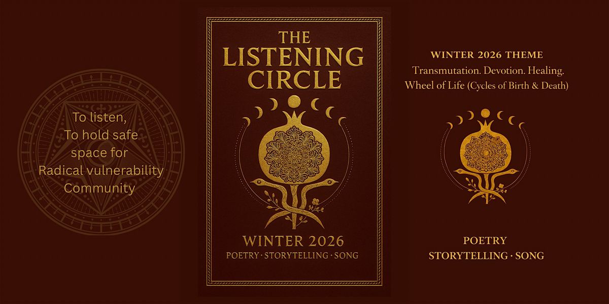 The Listening Circle, founded in 2023, is an intentional gathering of local and international artists devoted to deep listening through poetry, story telling, and song. After more than 40 successful circles in last 2 years, holding a multitude of diverse voices, the Winter 2026 is guided by the themes of Transmutation, Devotion, Healing, and the Wheel of Life (Cycles of Birth and Death.)