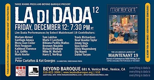 The line-up features renowned contemporary DADA artists including Mariam Ahmed, Santiago Amaya, Mona Jean Cedar, Rich Ferguson, Kathleen Florence, S.A. Griffin, Mark Hoefer, Tom Laichas, Marie C Lecrivain, Bibiana Padilla Maltos, Bronwyn Mauldin, Richard Modiano, Mike M. Mollett, Harry E. Northup, Travis Richardson, Neal Skooter Taylor, Jimmy Vega, Voxx Voltair, Silvia Wagensberg, Dig Wayne, and Daniel Yaryan. Three Rooms Press co-founders and MAINTENANT editors Peter Carlaftes and Kat Georges will host the evening.