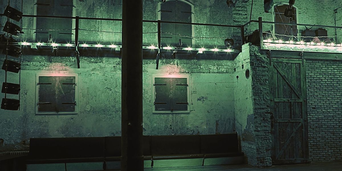High ceilings, rusty steel railings, and flickering lights cast an eerie glow over the scene. Time seems to stand still here—haunted by shadows of the past and lost souls.