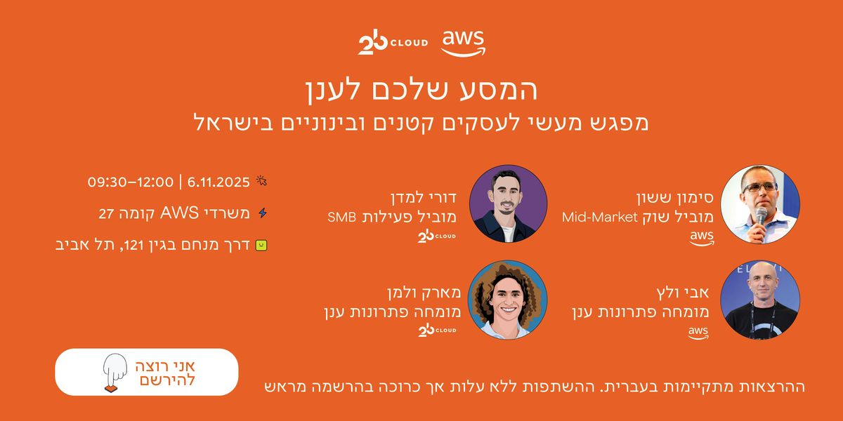 Info: קרדיטים חינמיים לכל המשתתפים. בחירת מסלול ברור להקמת פיילוט ראשון בענן ללא עלות וללא התחייבות עם ליווי אישי של מומחי ענן בינלאומיים.